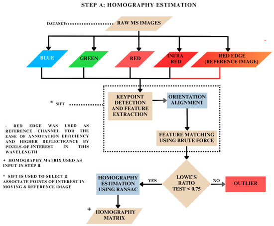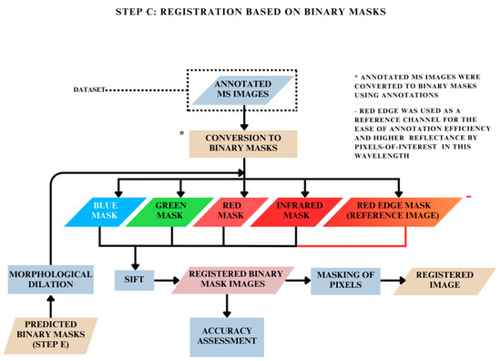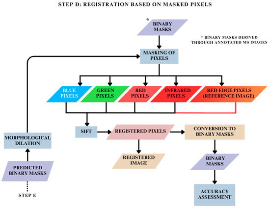 The predicted and dilated instance masks obtained in Section 2.10 across the four spectral channels from the testing and validation datasets are now used for masking the pixels of interest over the raw MS images (Step D). Subsequently, these non-zero pixels are registered using the SIFT and RANSAC to alter the spatial coordinates of the pixels throughout the four spectral channels with respect to the RedEdge channel.