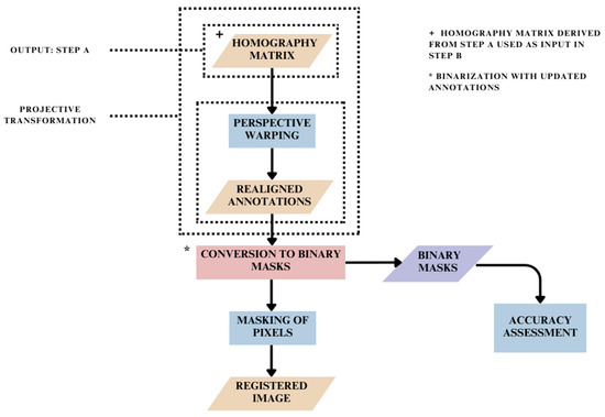 The pixels of interest were masked using the binary masks obtained after conversion in Step C focused on image registration based on binary masks and raw MS images of the dataset (Figure 7). Subsequently, only these non-zero pixels of interest were registered using SIFT and RANSAC methods as described in Figure 4. The implementation is described in Figure 8.