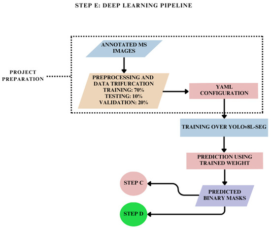 The dataset was prepared to allot 60 images for training, 8 for testing and 12 for validation. Subsequently, a YAML configuration file was created to associate the relationship between training data, annotations, and weights. A configuration of 200 epochs was chosen for training. The best training weight obtained after training was used to predict the mask instances, which were subsequently fed to Steps C and D (Figure 9) of the overall methodology.