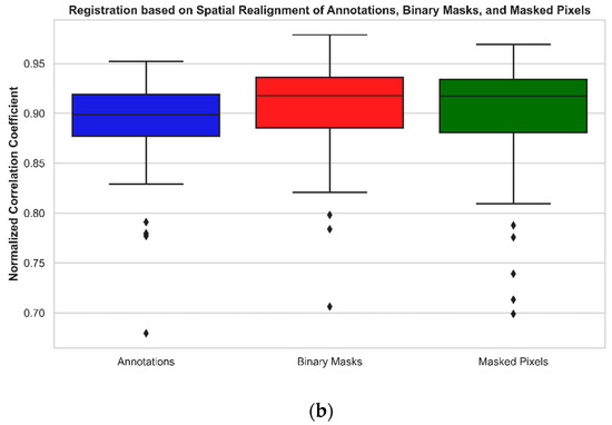 The boxplot in Figure 10b shows that the mean NCC for the registration based on binary masks is the highest, recording a mean value of 0.9059 in comparison to the mean NCC observed for the registration applied on masked pixels and spatial realignment of annotations, which are 0.8971 and 0.8900, respectively. There are three outliers observed in the case of registration based on binary masks with two outliers occurring in the range of 0.75–0.8 and only one outlier occurring in the range of 0.7–0.75. In the case of registration based on masked pixels, a total of five outliers are observed, with two outliers occurring in the range of 0.75–0.8 and the remaining three outliers occurring in the range of 0.7–0.75. However, in the case of registration based on spatial realignment of annotations, five outliers are observed, with four outliers occurring in the range of 0.75–0.8 and the last outlier observed below 0.7. This, again, demonstrates that the registration method based on binary masks performed the best, followed by the registration method based on masked pixels, and lastly, the registration method based on spatial realignment of annotations. Table 2 presents the mean NCC across the above-mentioned methods.