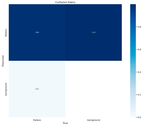 The YOLOv8l-seg’s ability to accurately identify instances within an image was assessed using the average precision (AP) metric, as outlined in the MS COCO challenges [59]. AP is determined by the area under the precision (P) and recall (R) curves (Equations (3) and (4), respectively), and it is typically computed for each class within an image and then averaged to yield the mean average precision (mAP). In this study, as the wild radish class is the sole instance of interest, the AP can be considered equivalent to the mAP (Equation (5)). The F1 score is computed as the harmonic mean of precision and recall, and it demonstrates how the model achieves a balance between accurate detection and thorough coverage. When evaluating segmentation tasks, precision (P), recall (R), AP, and F1 score are calculated as follows [60,61]:
