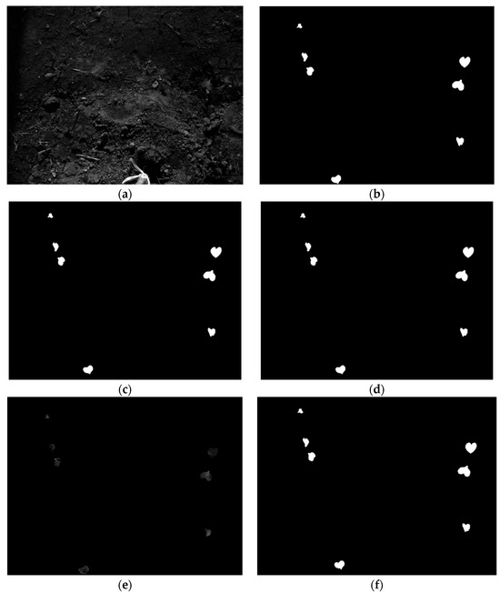 (a–e) Blue, green, red, near-infrared, and RedEdge instances of R. raphanistrum weed; (f) RGB instance of heterogenous mix of Triticum aestivum crop and R. raphanistrum weed.