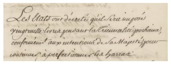 Our Mask-RCNN neural network was trained with the DRoSB dataset. These are French documents dating from the XVIIIth century that record the decisions of the States of Burgundy, which, under the Old Regime, governed the province together with the royal power. These texts consist of 120 double pages of 20 to 60 lines each. They cover several decades with a fairly homogeneous layout without being identical on each page. The pages can contain a title, the body text and margin notes. The lines have a variable spacing (generally quite wide, but some pages are denser). There are words between the lines, which we decided to treat as a separate line. Transparency (text on the back of the page that you can see) is very variable; some pages do not have any and others are hard to read because of this transparency. Above all, the challenging recurrent feature of these texts is the presence of long ascending and descending strokes, provoking numerous overlapping lines. Stains on the pages are rare, but they do exist. Some of the documents are available on https://iiif.lettres-en-lumieres.org/ (accessed on 1 September 2023).