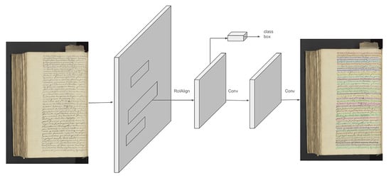 Blocks with the same spatial dimension in the encoder and decoder are connected by skip links that preserve the features obtained at different resolutions. These specifications require nonoverlapping masks as ground truth to train the network. In the inference phase, a post-processing step is required to separate the overlapping masks or to recover the text line boundaries if the output is the baseline [20]. For example, considering the dhSegment neural network, as indicated by [20], post-processing corresponds to the following four steps: thresholding, morphological operations, connected component analysis, and shape vectorization. Such processes are not necessary with Mask-RCNN.