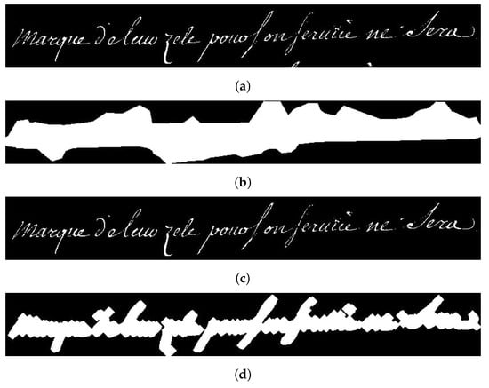 In detail, the image is first binarized using the Otsu algorithm (Figure 7a), and then multiplied by the generated mask (Figure 7b). These steps are similar to those described for foreground pixel accuracy (FgPA) in [35]. However, we are not proposing a new metric with the LMP, as [35] did with the FgPA, but a new mask processing in order to make existing metrics more accurate. The result of this multiplication step (Figure 7c) is then subjected to a closure operation derived from morphological mathematics (Figure 7d). This step allows LMP to be used in metrics that focus on object segmentation, such as those detailed in the previous section. Finally, we apply a logical “and” between the processed mask and the generated mask to obtain a constant mask that is larger than the letters, but without any noisy data.
