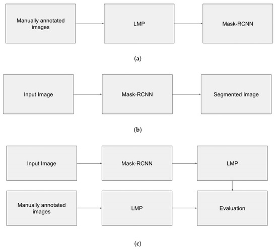 Panels (a–c) show where the LMP is applied in our processing pipeline. (a) Use of LMP during network training; (b) Use of Mask-RCNN for inference; (c) Use of LMP during validation.