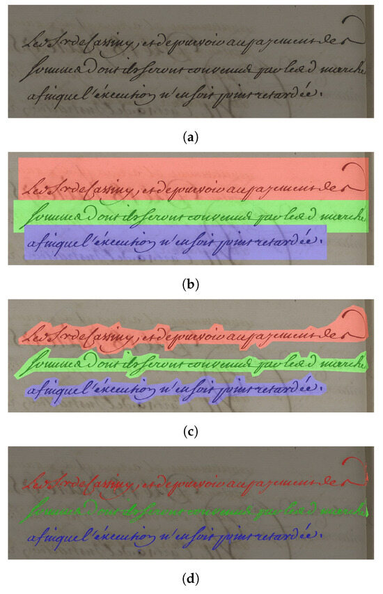 Different approaches of segmentation. (a) Example of text line; (b) bounding box approach; (c) mask approach; (d) pixels of line level obtained after light mask processing. (Applied to text lines from the DRoSB database, courtesy of the Archives of the Côte d’Or Departmental Council, Copyright 2023 (©/CD21/F.PETOT/2023)).
