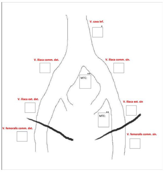 Digital subtraction phlebography (DSP) was performed in all patients using the same monoplane Angiography System (Siemens Artis Q.zen, Siemens Healthineers, Erlangen, Germany), using a manual contrast injection of 20 mL of Visipaque 270® (General Electric Health Care, Milwaukee, WI, USA) for each subtracted series. The injections were performed systematically, first using a 6 F sheath (Prelude PRO™, Merit Medical, South Jordan, UT, USA) inserted in the popliteal vein, and, afterward, utilising a 4 F, 90 cm long, straight open-end and side-holes diagnostic catheter (NYLEX™ Angiographic Catheter, Cordis, FL, USA) first placed in the common femoral vein, followed by the external iliac vein and in the common iliac vein. DSP dynamic series were recorded and stored in our department’s picture archiving communication system (PACS).