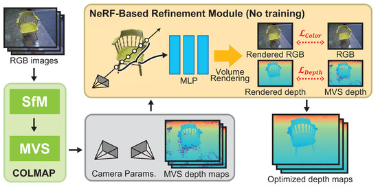 The proposed method consists of camera parameter estimation by SfM, depth map estimation by MVS, and depth map refinement by NeRF optimization, taking multi-view images as the input. The framework of the proposed method is shown in Figure 1, which is inspired by DS-NeRF [23]. DS-NeRF uses sparse 3D point clouds obtained by SfM to train the MLP so as to synthesize novel views using NeRF. On the other hand, the proposed method refines the depth map obtained by MVS through the optimization of an MLP, which is different to DS-NeRF. The proposed method uses COLMAP to estimate the camera parameters [13] and depth maps [3] to compare the performance of the proposed method with that of DS-NeRF. Therefore, it should be noted that the COLMAP process can be replaced by other SfM and/or MVS methods in the proposed method. The proposed method iteratively optimizes the MLP representing the radiance field using the dense depth map estimated by MVS. We optimize the MLP so that the depth map is synthesized by volume rendering to be close to the depth map estimated by MVS, and so that the image from the same viewpoint as the input image is synthesized. As a result, it is possible to estimate the depth in poor-texture regions and at object boundaries that cannot be estimated by MVS. We obtain a depth map that is more accurate than MVS by volume rendering the depth map using the optimized MLP.