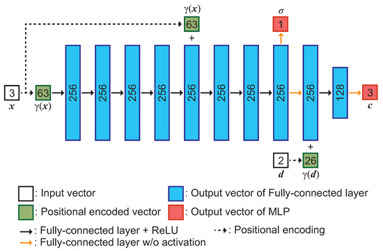 An MLP, which refines the depth maps obtained by MVS, consists of the network architecture as shown in Figure 2. This network architecture is designed based on DS-NeRF [23]. A 3D point and its direction are inputs, and RGB values and the density of are outputs. Three-dimensional points and view direction are applied during positional encoding [6] to create higher dimensional vectors and , which are input to the MLP. We generate 256-dimensional feature vectors passing through eight fully-connected layers with the ReLU activation function. The output of the fifth layer is concatenated with using skip connection. Then, the 3D point density and 256-dimensional feature vectors are obtained by passing them through a fully-connected layer. The output feature vector is then concatenated with the feature vector , and the RGB values of the 3D points are output through a fully connected layer.