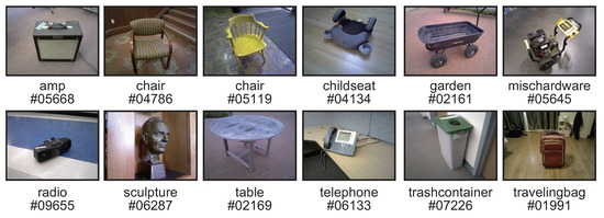 Redwood consists of 10,933 RGB-D video images taken in a variety of scenes and 441 3D mesh models. There are 44 different categories of scenes, such as chairs, tables, sculptures, and plants. The RGB-D video images were taken by non-experts in computer vision, and many of them contain low-quality frames and poor-texture regions. Therefore, it is difficult to reconstruct 3D shapes from the multi-view images in Redwood using MVS due to external factors such as motion blur, noise, poor-textured objects, and illumination changes. In our experiments, we use 12 scenes: “amp#05668”, “chair#04786”, “chair#05119”, “childseat#04134”, “garden#02161”, “mischardware#05645”, “radio#09655”, “sculpture#06287”, “table#02169”, “telephone#06133”, “travelingbag#01991”, and “trashcontainer#07226” as shown in Figure 3. We extract 11 frames from the RGB-D video image of each scene, and use the RGB image with 640 × 480 pixels of each frame as the input and the depth map as the ground truth for accuracy evaluation. The camera parameters for each viewpoint used in all the depth map estimation methods are estimated by SfM in COLMAP [13].