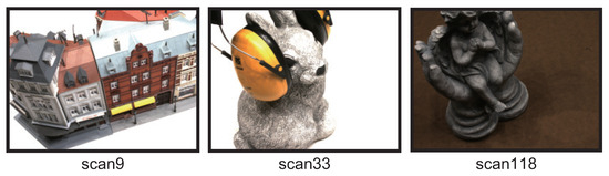 DTU consists of multi-view images of a variety of objects, a 3D point cloud measured by a laser scanner, and the camera parameters. The multi-view images consist of a set of images with 1600 × 1200 pixels, which are taken of each object from 49 or 64 viewpoints. Multi-view images in DTU are acquired under the controlled environment. Therefore, we can evaluate the potential performance of MVS methods themselves since there are few external factors using DTU. There are 124 types of objects, such as building models, animal figurines, plants, and vegetables. We use the “scan9”, “scan33”, and “scan118” as shown in Figure 4. Due to the processing time, we resize the images to 800 × 600 pixels and use them as input images. Since the images in DTU were taken under seven different lighting conditions, we use the multi-view image taken under one of the seven lighting conditions. The camera parameters for each view used in all the depth map estimation methods are estimated by SfM in COLMAP [13]. Since DTU does not have the ground truth for evaluating the accuracy of the depth map estimation, we use the depth maps created by Yao et al. [5,15].