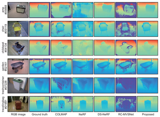 In our experiments, we compare the accuracy of depth map estimation among COLMAP [3], NeRF [6], DS-NeRF [23], RC-MVSNet [17], and the proposed method to demonstrate the effectiveness of the proposed method. NeRF and DS-NeRF train an MLP that represents the radiance field using multi-view images so that novel view images can be synthesized. By inputting a novel view direction to the trained MLP, the image and depth map of that view can be synthesized. NeRF and DS-NeRF need to train an MLP using training data and evaluate it on test data. On the other hand, the proposed method optimizes an MLP that represents the radiance field so that the input images and depth maps can be synthesized. In this experiment, we estimate depth maps for the input known viewpoints. To evaluate the accuracy under the same conditions as the proposed method, NeRF and DS-NeRF trained an MLP using the input multi-view images and use the trained MLP to synthesize depth maps for the input multi-view images. Therefore, we trained NeRF and DS-NeRF a certain number of times as in the proposed method. Table 1 shows the hyper parameters used in the experiments. The number of training or optimization iterations was set to 15,000 for Redwood and 100,000 for DTU, since the number of images and the number of pixels are different for each dataset. The batch size, which represents the number of rays in each iteration, was set to 5120. DS-NeRF and the proposed method, which require the depth map loss to be calculated, have a parameter that controls the ratio of depth rays used to calculate the depth loss within the batch size and the weights of the loss function. The ratio of depth rays used in DS-NeRF and the proposed method are set to 0.5 and 0.2, respectively, and is set to 0.1 for both methods. NeRF, DS-NeRF, and the proposed method use hierarchical volume sampling [6] as a sampling method based on the density of points on a ray. Hierarchical volume sampling first produces the color and density of 3D points in a coarse network, and then produces the color and density of 3D points belonging to high-density regions in a fine network. We set and for all the methods in the experiments. In the experiments, Adam [30] is used as the optimizer. The learning rate begins at and decays exponentially to during the optimization process. For RC-MVSNet, we use the trained model and evaluation code available in the official GitHub repository (https://github.com/Boese0601/RC-MVSNet (accessed on 26 Feburary 2024)). The threshold for the reprojection error used in depth map filtering is set to 0.5 pixels.