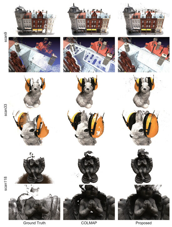 Figure 8 shows the reconstructed 3D point clouds for COLMAP and the proposed method. Note that the background regions are detected by image segmentation using SAM [32] and are masked in the depth maps to reconstruct the 3D point clouds for better visibility. In “scan 9”, the proposed method has fewer missing regions on the roofs of building, and fewer outliers around chimneys and walls than COLMAP. In “scan33”, COLMAP cannot reconstruct 3D points in the region with poor texture on the headset, while the proposed method can reconstruct 3D points even in such a region. In “scan118”, the proposed method can reconstruct the 3D points in the region where COLMAP cannot. In particular, in “scan118”, the proposed method has a wider reconstruction range than COLMAP. These results indicate that the proposed method can reconstruct regions that cannot be reconstructed by COLMAP by refining the depth map estimated by COLMAP.