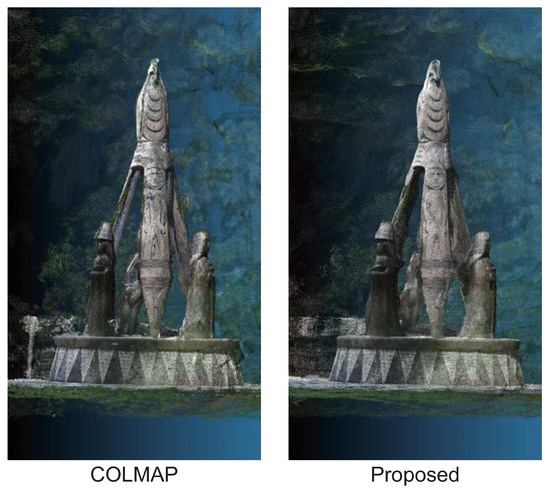 We evaluate the applicability of the proposed method by performing 3D reconstruction from multi-view images taken outdoors using an ordinary camera. The dataset consists of 35 RGB images of “Shore to Shore”, which is a 14-foot bronze-cast sculpture located in Vancouver’s Stanley Park, Canada, taken by the authors in June 2023. Figure 9 shows examples of images used in this experiment. It is a difficult situation to apply multi-view stereo and NeRF to since not only the sculpture but also dynamic objects such as tourists are in the image. Figure 10 shows the results of 3D reconstruction from multi-view images using COLMAP and the proposed method. COLMAP reconstructs the details of the sculpture, while there are many outliers on the object’s surface and at the object boundaries. The proposed method reconstructs the sculpture with high accuracy due to there being few outliers on the object’s surface. From the above, the proposed method can refine the depth maps estimated by COLMAP in real-world environments.