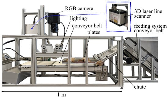 The laboratory setup by Anding et al. [29,30] is shown in Figure 1. The feeding system with object separation can be seen on the right, and the imaging area is next to the separation plates. Both cameras are positioned above the illumination system and imaging area. The separation of objects is implemented by the combination of two conveyor belts moving at different speeds and the array of separation plates, which are arranged orthogonal to the movement direction of the second conveyor belt. In order to accomplish homogeneous illumination for the reduction of object shadows, the objects were illuminated using two angled light sources from above and one light source below the conveyor belt. For depth data acquisition, no additional illumination was needed.
