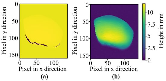 Both cameras were chosen based on each other’s parameters to ease the data fusion process later on. Although imaging objects placed on a conveyor belt results in a shadow below the object due to illumination, this is a cheaper alternative. The shadow below the object does not exist with planar objects and is not relevant for the detection of defects on the surface of the object. The important attributes of each camera are shown in Table 1 [49,50]. The number of active pixels for the laser line scanner was reduced by binning due to the necessary speed of the converter belt to ensure the proper separation of the objects. Using the full scanner would have resulted in missing pixels in the depth image.
