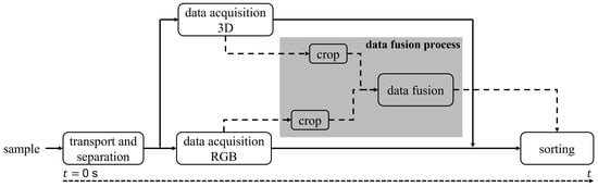 An overview of the data fusion process is shown in Figure 5. Before the preprocessing algorithm is used, the incoming samples of the conveyor belt are cropped to remove the background. Afterward, the preprocessing algorithm is used on the acquired samples. On the one hand, the RGB data need to be synthesized to create an image of the full object without the RGB artifacts caused by the conveyor belt. Meanwhile, the depth shadows mentioned in Figure 3 are removed from the 3D data.
