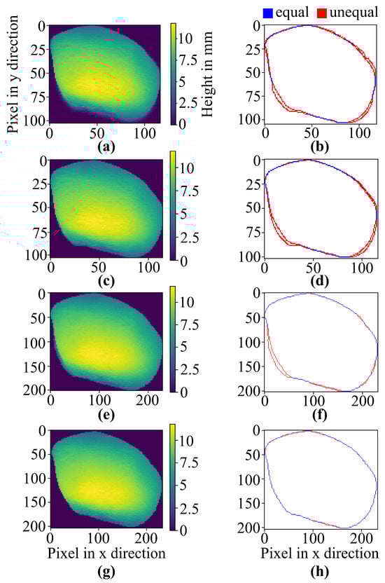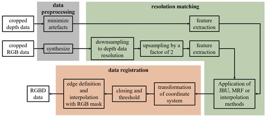 The downsampling is necessary due to the ROI issue, as described in Section 3. The resolution of both data is not exactly an integer multiple of each other. The RGB data were chosen as reference data due to their higher source resolution. So, the RGB data were first downsampled to the resolution of the depth data. In the second step, they are upsampled by a factor of two to meet the requirement for guided upsampling methods such as JBU and MRF.