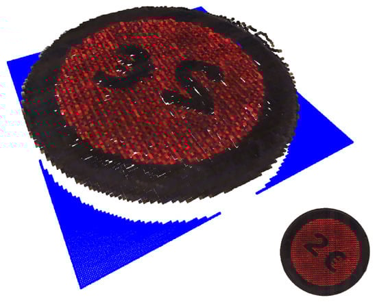 Figure 6 shows the RGB-D point cloud of the validation coin. One can see the texture on the coin combined with the height profile, with a total diameter of 23 ; the height resolution matches the texture resolution provided by the RGB image.