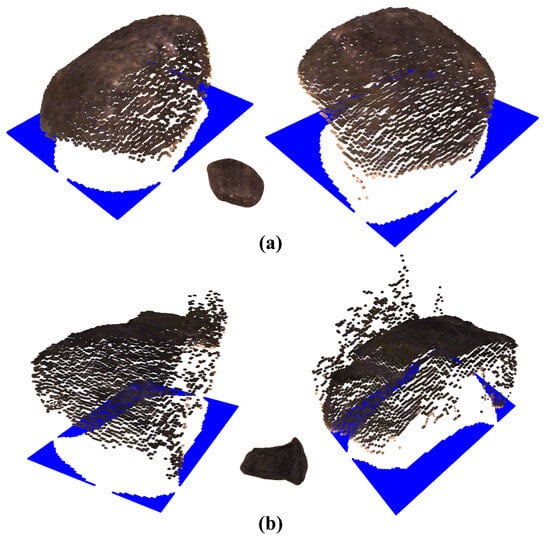 Figure 7 shows the resulting RGB-D point cloud for the two example stones, which were retrieved using the described JBU setup. By using a 3D laser line scanner and an RGB line camera, high-resolution RGB-D images were created. This enables volume approximation and the detailed location of textual and form-based features. However, there are also flaws seen in Figure 7b. Figure 7b shows noisy depth points due to the rough or reflective topography of the analyzed object, which leads to measurement errors in the depth measurement due to the scattering of the laser beam. Smoothing over this region via the neighborhood would lead to fewer deviations.
