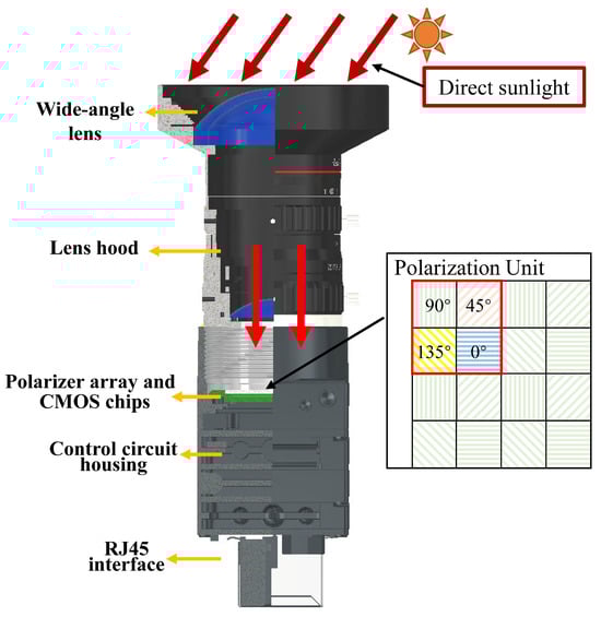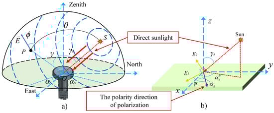represents incident light intensity of direct sunlight, represents the transmitted light intensity of , and represents the angle between and the polarity direction of the polarizer. Alternatively, following the fundamental transmission mechanism of polarized light [], the intensity of the transmitted light through the polarizer for the electric field vector can be represented as follows: