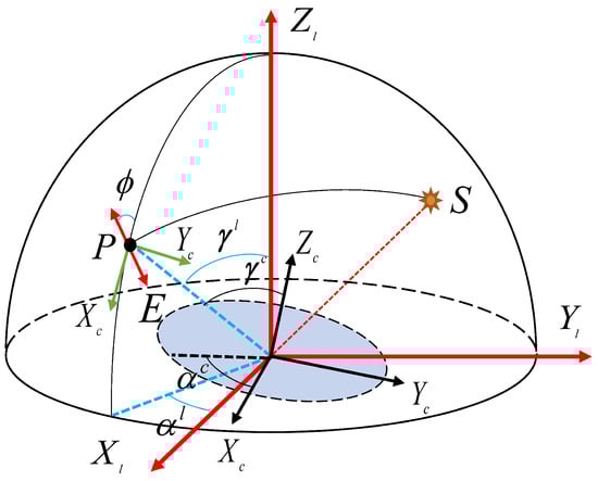 The Rayleigh model is employed to characterize the polarization pattern throughout the entire sky, where the polarization E-vector direction is perpendicular to the scattering surface. Additionally, we consider the influence of the carrier tilt on heading measurements. The representation for E-vector of different reference coordinate systems in tilted state is shown in Figure 4. S represents the sun position, and P represents the observation position.
