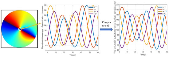 By setting the rotation rate of the PS to 720° in 100 s, the output of the light intensity under direct sunlight interference for multiple polarization channels can be obtained. The output of a single polarization channel in the central region is shown in Figure 5. The left image represents a simulated AOP image. The middle image represents the intensity of light output by the four polarization channels in the central region, which is affected by direct sunlight interference. The image on the right represents the polarization channel output after direct sunlight compensation. It can be seen that the amplitude and phase for imaging PS under different polarization directions are obviously disturbed. After direct sunlight compensation, although there is still a slight difference in amplitude, the phase and period of the compensated polarization channel show significant consistency. This is because the optical center of the simulated camera is not consistent with the pixel center, and the position of the observation vector cannot completely coincide with the zenith direction during rotation, resulting in differences in the polarization information source of the observation direction itself. The progressiveness of the method will be further verified through heading measurement experiments.