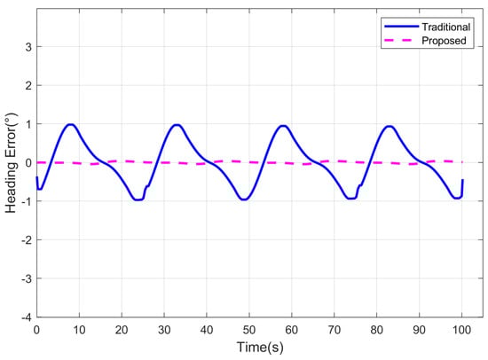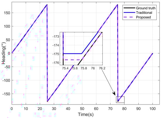 Then we use polarization orientation methods based on different PS models for polarization heading calculation. The traditional method does not consider the impact of direct sunlight [,,], while the proposed method adopts the improved polarization detection model for orientation. In the proposed method, a normal distribution random noise with a mean of 0° and a variance of 0.5° was applied to the heading reference value, serving as the prior heading (). In the simulation experiment, the heading measurement results of different methods are depicted in Figure 6. It can be observed that the proposed method, incorporating direct sunlight compensation, effectively suppresses the impact of direct sunlight on the detected intensity for the polarization channel. Compared to the traditional method, the directional measurement results of the proposed model more closely approximate the true heading.