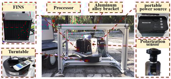In this section, outdoor experiments were conducted to validate the proposed methods’s heading measurement performance under actual direct sunlight interference. The equipment used in the outdoor experiment is depicted in Figure 8. The imaging PS system consists of a polarized camera and a fisheye lens. The heading accuracy of the Fiber Optic Inertial Navigation System (FINS) is up to 0.02°, where , and L represents the latitude of the location. And it is sufficient to be used as the reference for polarization orientation. The specific parameters of the equipment are detailed in Table 2. The experiment was conducted near Harbin (longitude 126.7264°, latitude 45.6234°, altitude 148.74 m) on 5 September 2023.