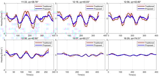 The heading results of various methods in outdoor experiments are depicted in Figure 9. represents the zenith angle of the sun. Both the traditional method and the proposed method exhibit proficient capabilities in computing the carrier’s heading information. However, due to the consideration of the influence of direct sunlight, the proposed method demonstrates a closer approximation to the reference heading compared to traditional models even in actual datasets. Subsequently, a quantitative analysis of the heading results, as illustrated in Figure 10, reveals that the heading errors of different methods closely align with simulation results, exhibiting a fluctuation amplitude dependent on the orientation of the carrier.