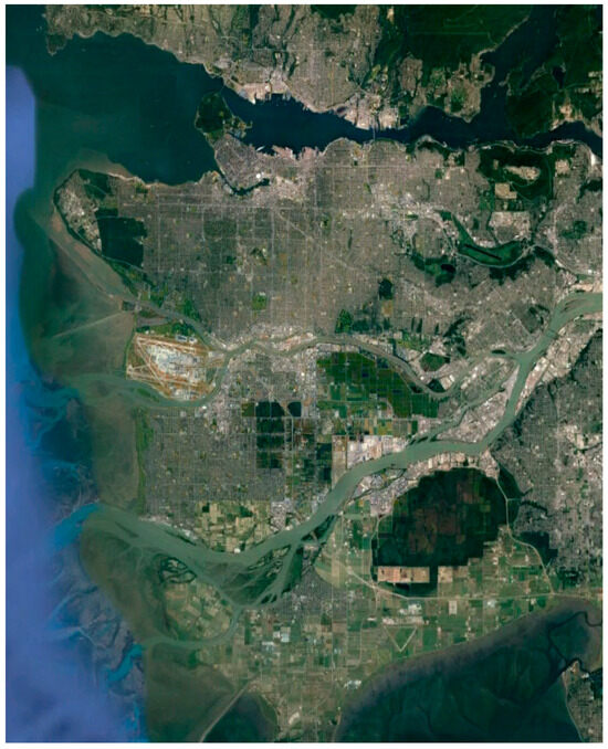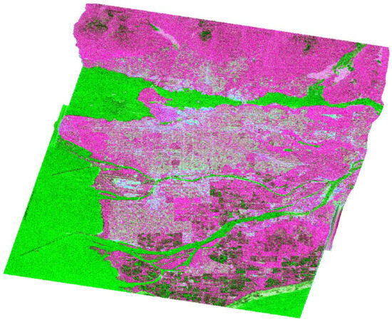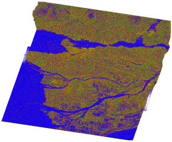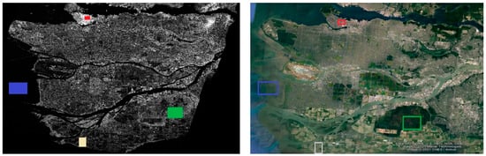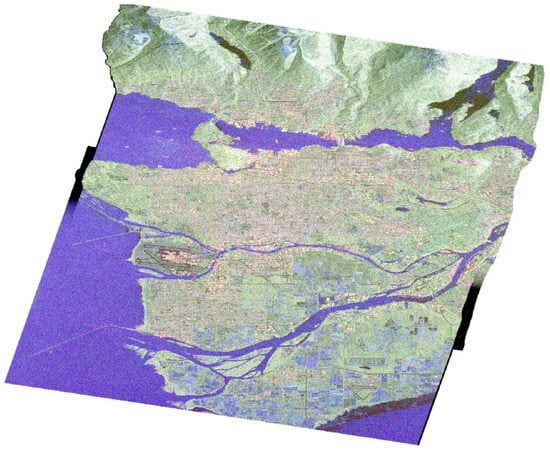 The data product was obtained from the RADARSAT-2 satellite mission [34] in April 2008 and depicts the broader area of Vancouver (Figure 1), utilizing C-band. The image was captured using the Fine Quad-Pol Beam mode, offering fully polarimetric imaging with a specified resolution of 5.2 × 7.6 [Range × Azimuth] (m2) and swath widths of approximately 25 km.