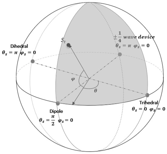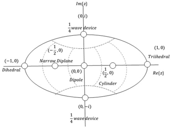 Table 1 provides detailed information on the complex vectors and their corresponding values of for symmetric elementary scattering types. The parameter ’s range implies that the scattering matrix can be accurately depicted by a point situated on the unit disc within the complex plane. Figure 5 visually illustrates the positions of various elementary scattering mechanisms on the unit disk, accompanied by delineated regions representing their association with these scattering mechanisms. A crucial observation is that, in accordance with the values of z presented in Table 1, all elementary scatterers are situated along the diameter of the unit disk, with the exception of the ¼ wave devices, which specifically reside on the imaginary axis.