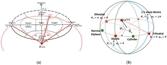 Cameron et al. in [22] investigated the characteristics of conservative symmetric scattering mechanisms, emphasizing the preference for a closed surface over a complex disk. The proposed optimal configuration involves a symmetric space represented by the unit sphere, achieved by linking conjugate pairs along the rim of the unit disk. This conceptualization was thoroughly illustrated through a mapping procedure outlined in [22], with its visual depiction showcased in Figure 6a,b. To elaborate, in this novel topology, they established a direct association between each point (x,y) within the unit disk and a circular arc, denoted as a a(x,y) on the unit sphere that encompasses the points (−1,0), (x,y) and (1,0). Notably, for points (x,y) not situated on the rim of the disk, the arc length is less than π. In such instances, the arc is “stretched” to attain a length equal to π, becoming part of a great circle. The mapping is visually clarified by associating each point (x, y) with a semi-circle, strategically positioned tangent to the sphere’s surface. The initial position (x,y) on the unit disk determines the latitude and longitude of the corresponding point on the unit sphere, with the spherical coordinates and given by: