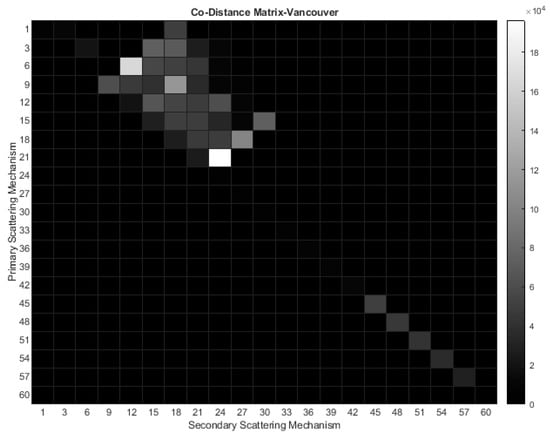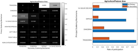 Finally, Figure 17 provides insight into the primary and secondary scattering mechanisms within the context of agricultural land cover. Given the flat nature of this land cover type, a certain resemblance to the sea, as depicted in Figure 14, is to be anticipated. This parallel is evident upon comparing the two heatmaps (Figure 14 and Figure 17), where the Trihedral mechanism stands out dominantly, yet with a heightened contribution and a greater presence of non-categorizable and asymmetric scatterers in the agriculture/pasture area. Moreover, in marine environments, the overwhelming predominance of the Trihedral mechanism is evident from the sheer clarity of the blue color. Conversely, in agricultural regions, the influence of the second most prominent scattering mechanism is noticeable, as it is reflected in several darker shades.