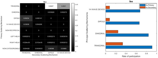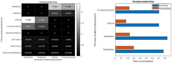 The participation rate of each Primary–Secondary scattering pair on the left side (Heatmap representation) and on the right side (bar diagram representation) for each scattering mechanism (pixel) in a forest/wooded area.