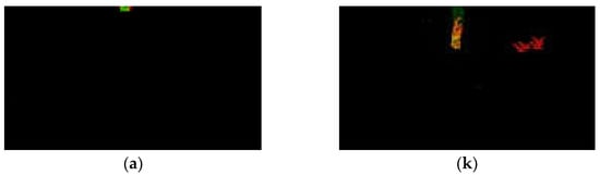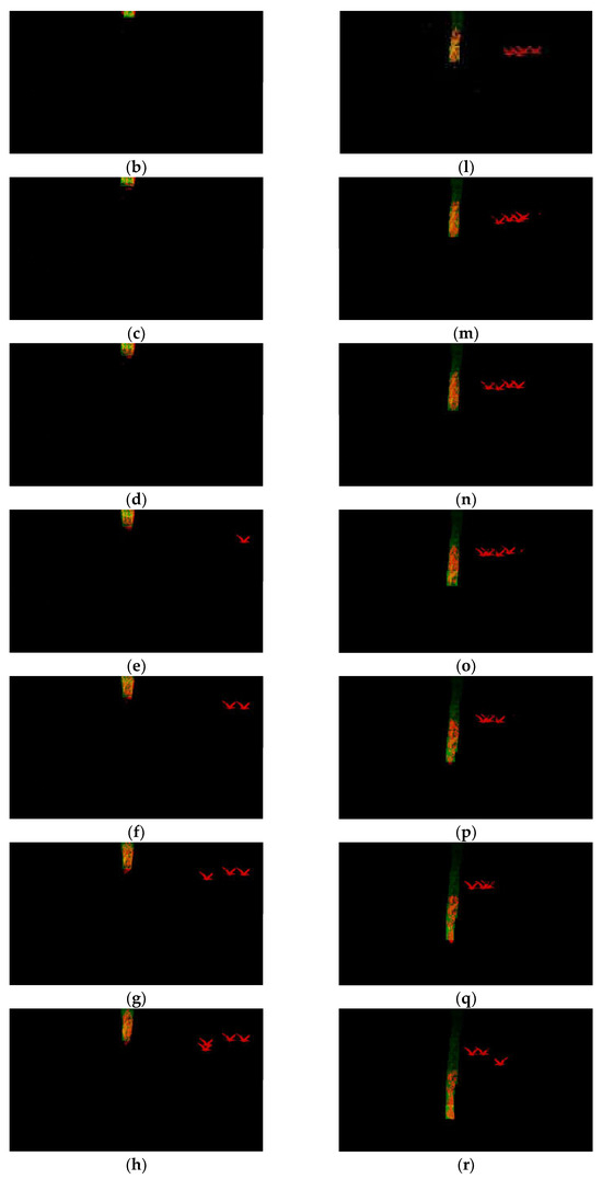 In the process of image analysis, we first convert the images to grayscale, which effectively reduces computational complexity and accelerates subsequent processing. When analyzing motion history trajectories, we select four frames as a processing unit and perform image differencing analysis. Specifically, we add the first F1st and second frames F2nd to obtain preliminary image changes . Then, we overlay the third frame F3rd with the previous two frames in an 8:2 ratio to obtain . Subsequently, we perform differencing between this overlaid image and the fourth frame F4th to obtain further image changes. α, β, γ, and ω represent the i. The equation is as follows: