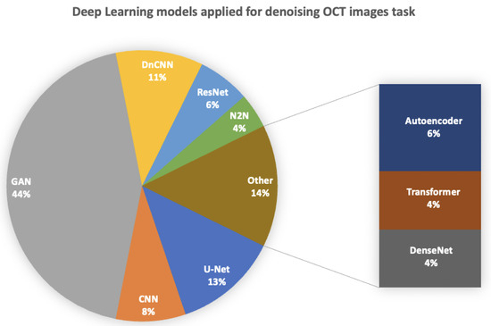 Numerous DL tasks consisting of detection, segmentation and classification are challenging in ophthalmology since OCT is the main imaging technique in that specific field. OCT introduces speckle noise that adds artifacts, thereby impairing image quality and confounding correct clinical interpretation [59]. Thus, DL has provided solutions for denoising and speckle reduction in OCT images to overcome this problem. In this systematic review, many studies were compiled and analyzed to assess the application of DL for image denoising of OCT images in ophthalmology. Over the past ten years, multiple researchers have shown a developing and promising body of evidence supporting DL for this task. Even so, there was a limited supply of quality studies for comparison across traditional programming and DL. A number of findings require more detailed discussion. The challenge of addressing numerous deep learning (DL) tasks in ophthalmology, including detection, segmentation, and classification, is compounded by the prevalent use of optical coherence tomography (OCT) as the primary imaging technique in this field. OCT introduces speckle noise, which can adversely affect image quality, thereby complicating accurate clinical interpretation. DL techniques have emerged as promising solutions for denoising and reducing speckle artifacts in OCT images, with this systematic review analyzing a multitude of studies to assess the application of DL for image denoising in ophthalmology. Over the past decade, researchers have generated a growing body of evidence supporting the efficacy of DL for this purpose. As shown in Figure 3, the main DL models implemented were the GAN, DnCNN, Autoencoder, U-Net, Noise2Noise, and transformer, etc.