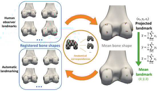 From the obtained anatomical correspondences, all manually annotated landmarks (cf. Section 2.1.2) of all but one subject (the subject of interest for automated landmark annotation) were propagated to the mean bone and cartilage shape in a leave-one-out experiment. Their coordinates were averaged to define the mean landmark position, projected on the mean bone and cartilage shape. To ensure equal weighting of the three observers in the mean of the landmark projections, the three landmark projections of observer 1 were averaged beforehand. Next, automated landmark annotation of all subjects was initialized by propagating the mean landmark positions to the corresponding vertices of the subjects. In a final step, the landmark positions at extreme locations were optimized according to their definition (Section 3.1) via a custom Python script (and VTK library [15]) to ensure their position was the most anterior/posterior, medial/lateral or proximal/distal point. The complete workflow is summarized in Figure 1.