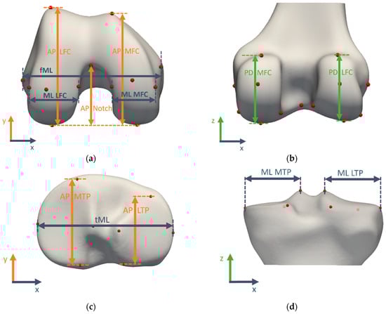 Morphometric measurements visualized on the template bone and cartilage shapes: (a) distal femoral view, (b) posterior femoral view, (c) proximal tibial view, (d) posterior tibial view. A complete overview of morphometric measurement definitions can be found in Table 2.
