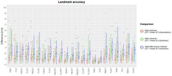 Expert mean landmarks served as ground truth landmark positions. Euclidean distances between the automatically determined landmarks and the ground truth landmarks were calculated as a measure of inter-method landmark variability.