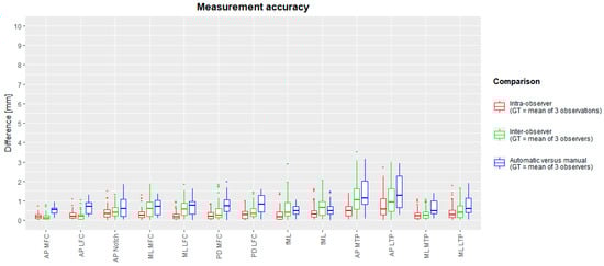 The median difference between the automated and manual methods was between 0.33 mm (AP MFC) and 1.72 mm (AP MTP). Maximal differences ranged between 0.74 mm (AP MFC) and 2.85 mm (AP MTP). A detailed overview per measurement is visualized as a box-and-whiskers diagram in Figure 5, and descriptive statistics are in Table 5. Intraclass correlation coefficients varied between 0.938 and 0.999 and are reported in Table 6. Success measurement rates are plotted in Figure 7 for different accuracy thresholds. For all but two measurements (AP MTP and AP LTP), at least 90% of the automated measurements were less than 2 mm different from the expert mean measurements. On average, over all measurements, 71% and 95% of all measurements had a difference below 1 mm and 2 mm with the expert mean measurement, respectively. Finally, Bland–Altman diagrams (Figure S1 in Supplementary Materials) showed similarly distributed errors over the full measurement range.