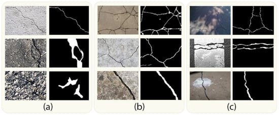 In newer developments, deep learning models and techniques have become widely embraced in the realm of computer vision applications. Several studies [,,,] have aimed to harness the powerful feature representation capacities of deep learning specifically for crack detection. For example, Refs. [,,] employ deep learning for patch-based classification in crack detection. While this approach is effective, it can be cumbersome and susceptible to variations in the scale of the patches utilized. On the other hand, Ref. [] approach crack detection as a segmentation task, leveraging deep learning to categorize each pixel as either part of a crack or part of the background. While this method achieves commendable results, as noted in [], the task of crack detection presents unique challenges compared to semantic segmentation, specifically regarding the disparity between the foreground (cracks) and background elements.