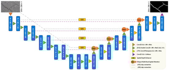 As illustrated in Figure 2, the model follows a U-Net-shaped architecture. Within the encoder section, we employ a Double Convolution Encoder (DCE) module. This module integrates sequential 2D convolution, batch normalization (BN), and ReLU layers, all tailored to extract features from pavement images efficiently. To further enhance the feature extraction capability in the encoder, a Spatial Depth Enhancer (SDE) module is integrated. The 3D convolution process is applied to images through this advanced module, which enhances the feature recognition capabilities of our model. In the decoder section of our model, we introduce the TriInput Multi-Head Spatial Attention (TMSA) module, which combines feature maps. Notably, each head within this module operates independently, capturing an array of spatial relationships. The outcomes of this process are then forwarded to the Convolution Transpose Decoder (CTD), consisting of 2D transpose convolution, batch normalization (BN), and ReLU layers. The CTD network then amplifies both the width and height dimensions, leveraging these enriched features to deliver precise crack detection results. As briefly mentioned, DepthCrackNet consists of four primary components, each of which is elaborated upon in subsequent subheadings: (1) Double Convolution Encoder (DCE), (2) Spatial Depth Enhancer (SDE), (3) TriInput Multi-Head Spatial Attention (TMSA), (4) Convolution Transpose Decoder (CTD).