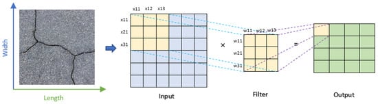 The convolutional layer is the central element of a CNN, acting by applying a convolution operation to the input data, which effectively serves as a specific type of filtering process. This operation is visually depicted in Figure 3. Throughout the training phase, the model fine-tunes the filter weights, empowering them to identify and emphasize the features most relevant to the problem at hand. In this scenario, “w” symbolizes the weight, “x” designates the input data, “b” represents the bias value, and N Output is the resulting output, as referenced in Equation (1).