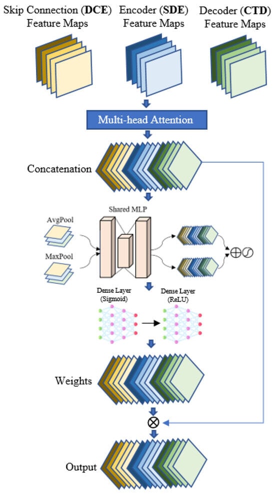 Attention mechanisms have revolutionized the way deep learning models interpret and prioritize information [,]. Instead of treating all inputs uniformly, attention allows a model to focus selectively on specific segments that are most pertinent for a given task. A multi-head attention mechanism takes this concept a step further. Rather than having a singular focus or perspective, multi-head attention enables the model to possess multiple “points of view” [,]. This ensures that the resulting feature map captures a rich set of spatial information from various perspectives. In the realm of crack pavement detection through segmentation models, the TriInput Multi-Head Spatial Attention (TMSA) module emerges as a pivotal innovation tailored for the decoder section. Details such as color, edge, and texture are encapsulated within spatial information, whereas semantic details contain contextual information crucial for classification tasks, albeit often lacking precision in terms of location and shape []. Conversely, spectral features capture the spatial connections among different points within the input image. This is achieved by means of reshaping and 3D convolution processes, as discussed in Ref. []. Since these features are derived through distinct methods, they inherently contain diverse content. In this study, rather than merging these feature maps directly, a unique approach was employed by forming a 3D-input multi-head attention structure. This TMSA module is fundamentally constructed upon the principles of the squeeze-and-excitation framework [], rather than directly merging the diverse feature maps. This module efficiently concatenates three different feature maps. Initially, the feature maps extracted from the double Conv2D layers (DCE) are propagated through the skip connections in the encoder. Subsequently, the spatial feature maps, produced by the Spatial Depth Enhancer (SDE) module, highlight depth-related intricacies. Lastly, the feature maps generated from the Conv2DTranspose (CTD) module within the decoder are intended to recover spatial details that may have been attenuated during encoding. The core idea behind the TMSA module is to employ multi-head attention, a mechanism enabling the model to focus on several spatial positions simultaneously. In the TMSA module, each head starts by sequentially concatenating all three inputs, resulting in a unified feature map. Subsequently, both 2D Global Average Pooling and Max Pooling layers are applied to calculate the average and maximum values across spatial dimensions within this unified feature map. This step generates a comprehensive representation of the merged feature maps, which is then channeled through two consecutive dense layers, with a ReLU activation function inserted in between. The output from these dense layers is subjected to a sigmoid activation, yielding weights corresponding to the spatial locations within the unified feature map. These weights are then reshaped and broadened to align with the spatial dimensions of the initial input feature map. The final step involves an element-wise multiplication between the expanded weights and the unified feature map. This ensures that each spatial location within the map is assigned a weight reflecting its relative importance. After all of the heads have completed their processing, their individual outputs are aggregated to construct the final attention-enhanced feature map. Through its intricate attention mechanism, the TMSA module guarantees that the resulting feature map emphasizes important regions, while also harmoniously integrating various spatial and depth-related cues. This amalgamation of spatial information is designed to significantly bolster the segmentation model’s proficiency in the precise detection of cracks in pavements. Figure 5 demonstrates the overall structure of the TriInput Multi-Head Spatial Attention (TMSA) module.
