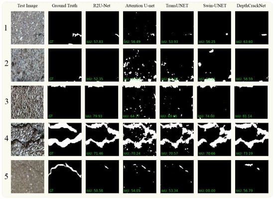 In Figure 7, we present a visual comparison of the ground-truth data extracted from the Crack500 dataset alongside segmentation results obtained from various methods, including our proposed DepthCrackNet. The figure is organized as follows: The first and second columns display the original images and their corresponding ground-truth segmentations. Columns 3 to 6 showcase the results achieved using the R2U-Net, Attention U-Net, TransUNet, and Swin-Unet methods, respectively. Finally, in column 7, we present the segmentation outcomes produced by our novel DepthCrackNet. This visual representation highlights the diverse and complex challenges encountered in pavement crack detection within the Crack500 dataset. In the first row, entailing small crack detection, our model outperforms with an IoU of 63%, demonstrating a more profound discernment of fine-grain features compared to the others, where R2U-Net, Attention U-Net, TransUNet, and Swin-Unet register IoUs of 57%, 56%, 53%, and 56%, respectively. This advantage is sustained in the second row, which introduces background similarity issues, with our model attaining an IoU of 58%, marginally superior to Swin-Unet at 56%, showcasing the model’s resilience to background noise. Significantly, in the third row, which encompasses tiny cracks on textured pavement, our model excels with an IoU of 81%, indicating its stronger ability to identify and delineate subtle defects amidst textured backgrounds. This is a noteworthy performance, as even the promising R2U-Net lags behind at 79%. In the segmentation of thick cracks, shown in the fourth row, our model’s IoU of 73.19% asserts its robustness in capturing prominent defect features against the competitive architectures, which hover around the 70% mark. The fifth row highlights the challenge posed by different pavement materials, wherein our model performs better with an IoU of 56%, while Swin-Unet fails notably with an IoU of 0. This underscores the need for a versatile architecture to handle various material textures in pavement crack detection.