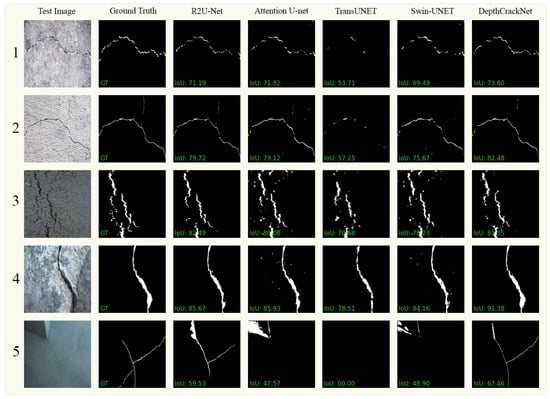 Visual comparison between the DepthCrackNet model and several leading models using the Crack500 dataset.
