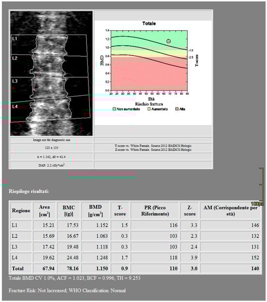 The “T-score” is a statistical value representing the deviation of the subject’s bone mineral density from the reference population (healthy population of the same sex aged 20–30 years) in terms of standard deviations. According to the World Health Organization (WHO), osteoporosis is diagnosed when bone mineral density is equal to or less than −2.5 standard deviations below that of a young, healthy adult female reference population, so when the T-score is equal to or below −2.5. A T-score between −1 and −2.5 indicates osteopenia.