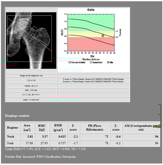 DXA measurements on the femoral neck (Regione: measurement region; Area: measurement area; BMC: Bone Mineral Content; BMD: Bone Mineral Density; PR: Reference peak; AM: Age Matched).